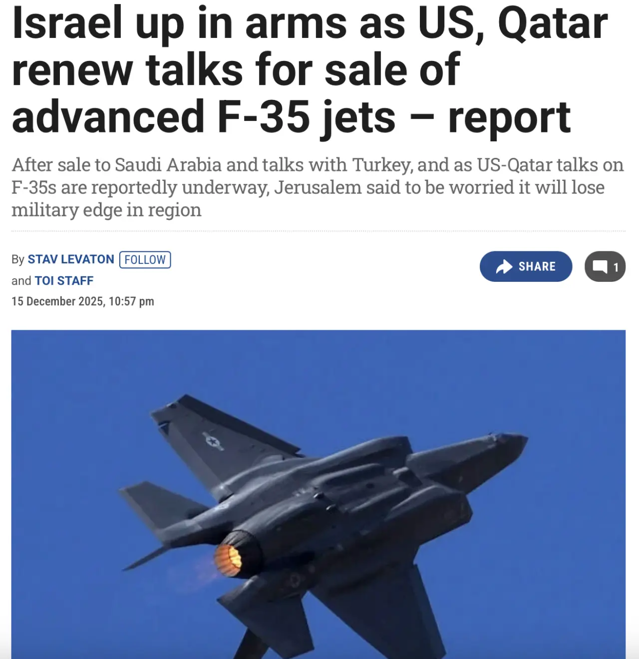 İsrail basınında yer alan raporlara göre, Washington yönetiminin Orta Doğu'daki müttefikleriyle yürüttüğü yeni silah ticareti görüşmeleri Tel Aviv'de soğuk duş etkisi yarattı. Channel 12’ye göre, ABD'nin Katar ile F-35 savaş uçaklarının satışı konusunda görüşmeleri yeniden başlatması, İsrail'in bölgedeki "niteliksel askeri üstünlüğünü" kaybedeceği korkusunu tetikledi.