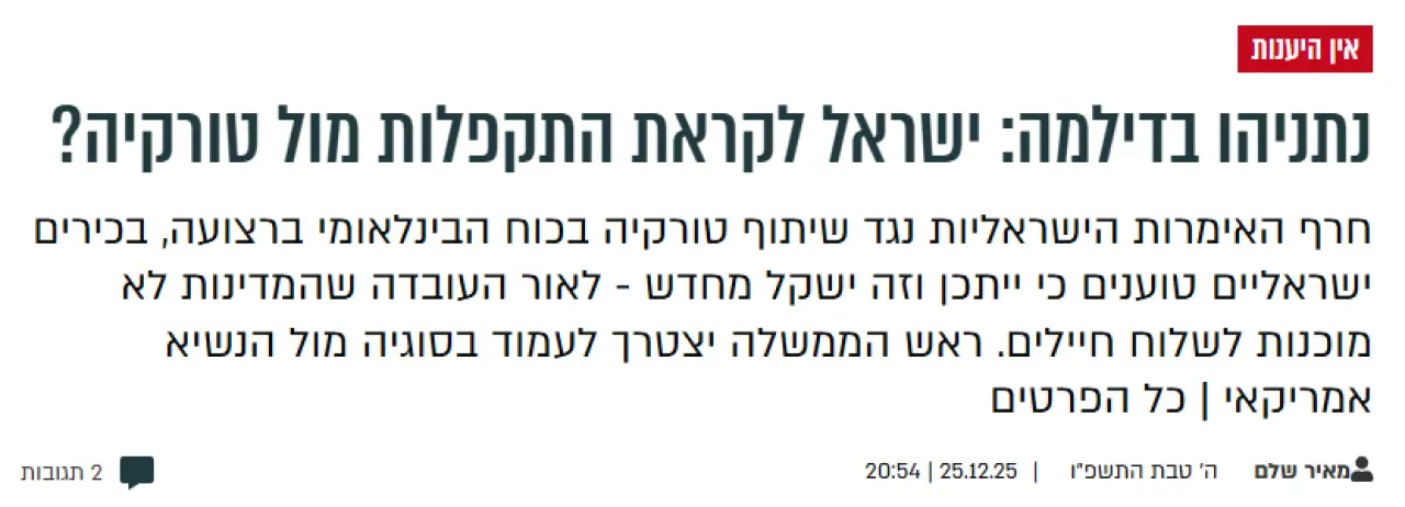 Analizde, Başbakan Binyamin Netanyahu'nun önümüzdeki günlerde ABD Başkanı Donald Trump ile yapacağı görüşmede bu konunun masaya yatırılacağı ve bir çözüm aranacağı ifade edildi. Öte yandan haberde, Türkiye'nin ABD ile ilişkilerde "güven artırıcı" adımlar atmaya hazır olduğu sinyalini verdiği iddia edildi. Bu kapsamda, F-35 savaş uçaklarının teslimi karşılığında, S-400 hava savunma sistemlerinin Rusya'ya iade edilmesinin de olasılıklar dahilinde olduğu öne sürüldü.