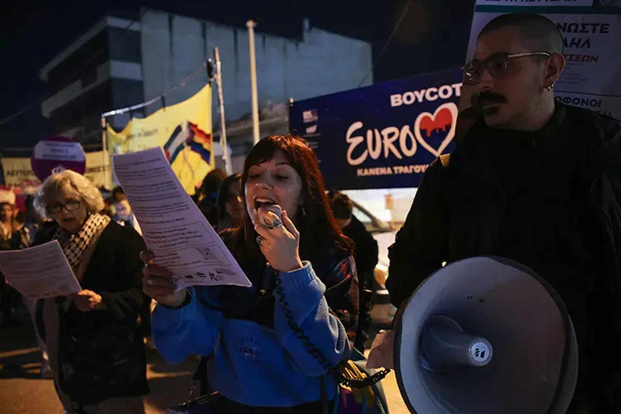 Aktivistler dağıttıkları el broşürlerinde, Yunan Devlet Televizyonu ERT’nin organizasyondan çekilmesine ve Eurovision gösterimi yapacak mekanların etkinliklerini iptal etmesine yönelik taleplerini dile getirdi.