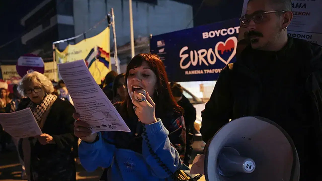 Final organizasyonunun yapıldığı Atina Festival Kompleksi önünde toplanan Filistin destekçileri, İsrail’in 2026 Eurovision Şarkı Yarışması'na katılmasını protesto etti.