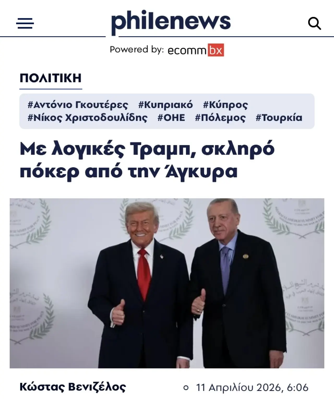 Philenews’te Costas Venizelos imzasıyla yayımlanan “Trump mantığıyla, Ankara’dan sert poker” başlıklı yazıda, bölgede süren savaşın pratikleriyle Türkiye’nin jeopolitik hedefleri bir araya getirildi. Yazı, Türkiye’yi “işgalci” sıfatıyla anarak, gelişmelerin Kıbrıs’ı ve “ulusal konuyu” etkileyebileceğini savundu. Ankara’nın “başrol oyuncuları” arasına girme isteğini öne çıkardı.