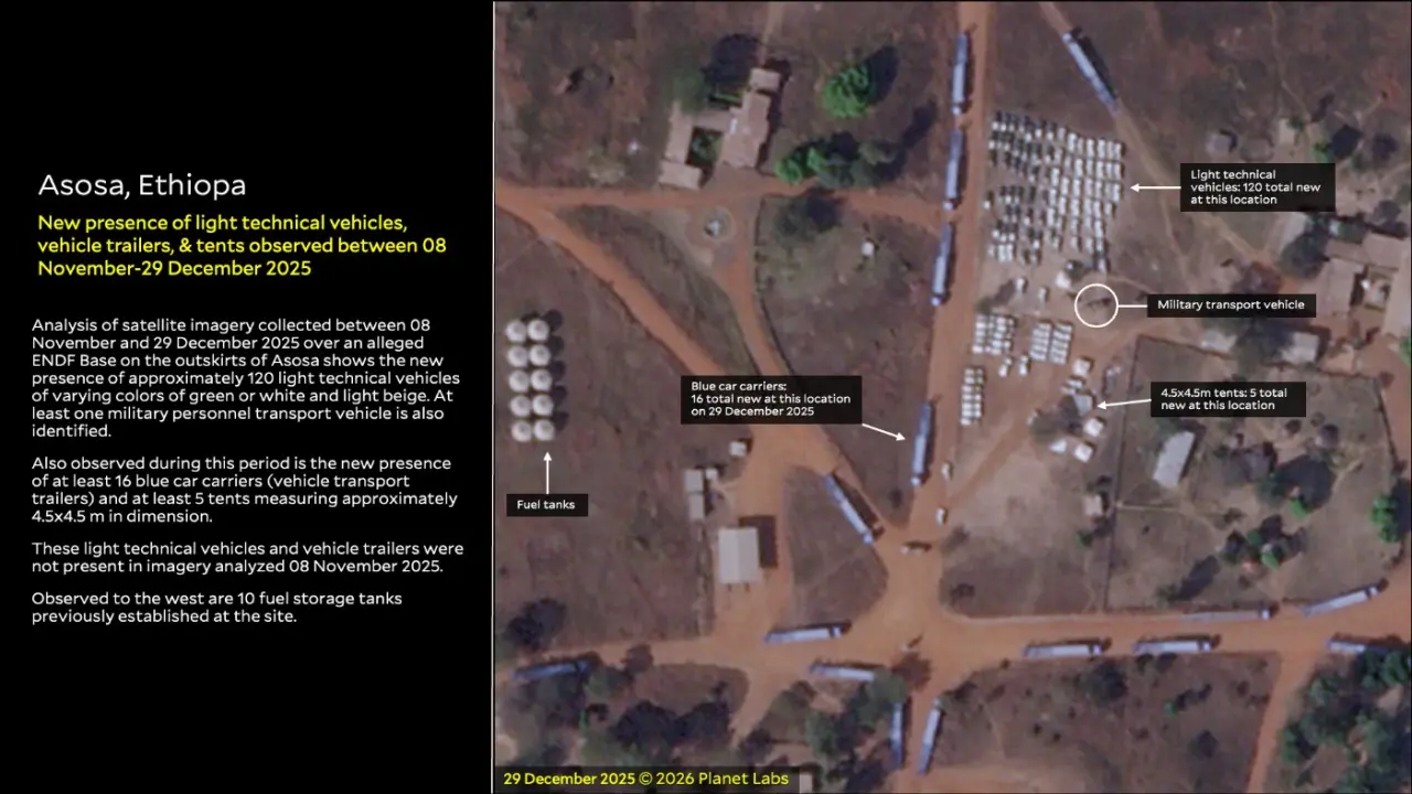 Asosa kırsalındaki üste askeri lojistik faaliyetlerin, Somali’den 1991 yılında ayrılarak bağımsızlığını ilan eden ve diplomatik olarak ilk kez Aralık 2025’te İsrail tarafından tanınan Somaliland’ın Berbera limanıyla bağlantılı olduğu tespit edildi.