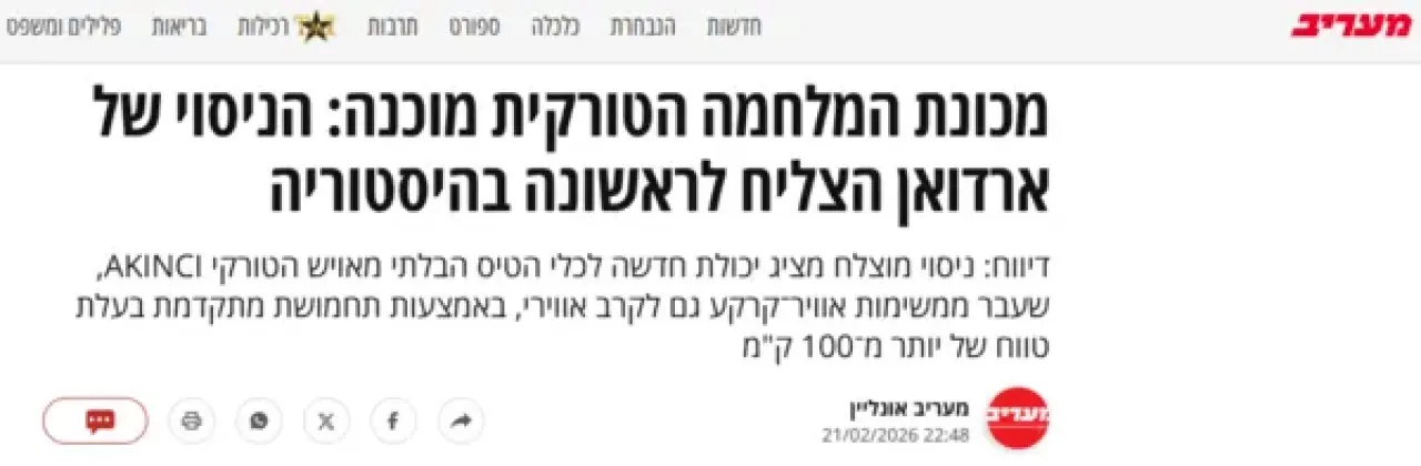 İsrail’in önde gelen gazetelerinden Maariv, gelişmeyi “Türkiye’nin savaş makinesi hazır: Dünyada bir ilk: Hava-hava yeteneği ilk kez başarıyla denendi” başlığıyla duyurdu. Haberde, AKINCI’nın başarılı atış testiyle yeni bir kabiliyet ortaya koyduğu ifade edildi.