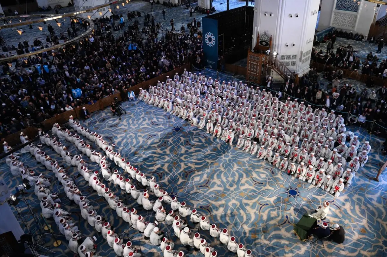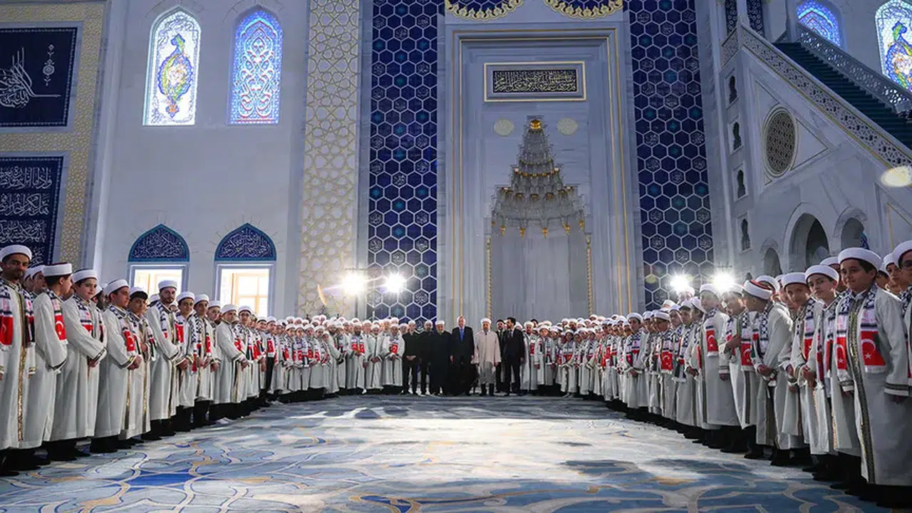 İmam hatip okulları ve Kur’an kurslarında eğitimlerini tamamlayan öğrenciler, Cumhurbaşkanı Erdoğan’ı cami girişinde tekbirlerle karşıladı. Öğrencilerin omuzlarındaki Türk ve Filistin bayraklı atkılar, törenin dikkat çeken ayrıntıları arasında yer aldı. Kur’an-ı Kerim tilavetiyle başlayan programda Cumhurbaşkanı Erdoğan Aşr-ı Şerif okurken, merasim reisülkurra Mustafa Demirkan’ın dualarıyla devam etti.