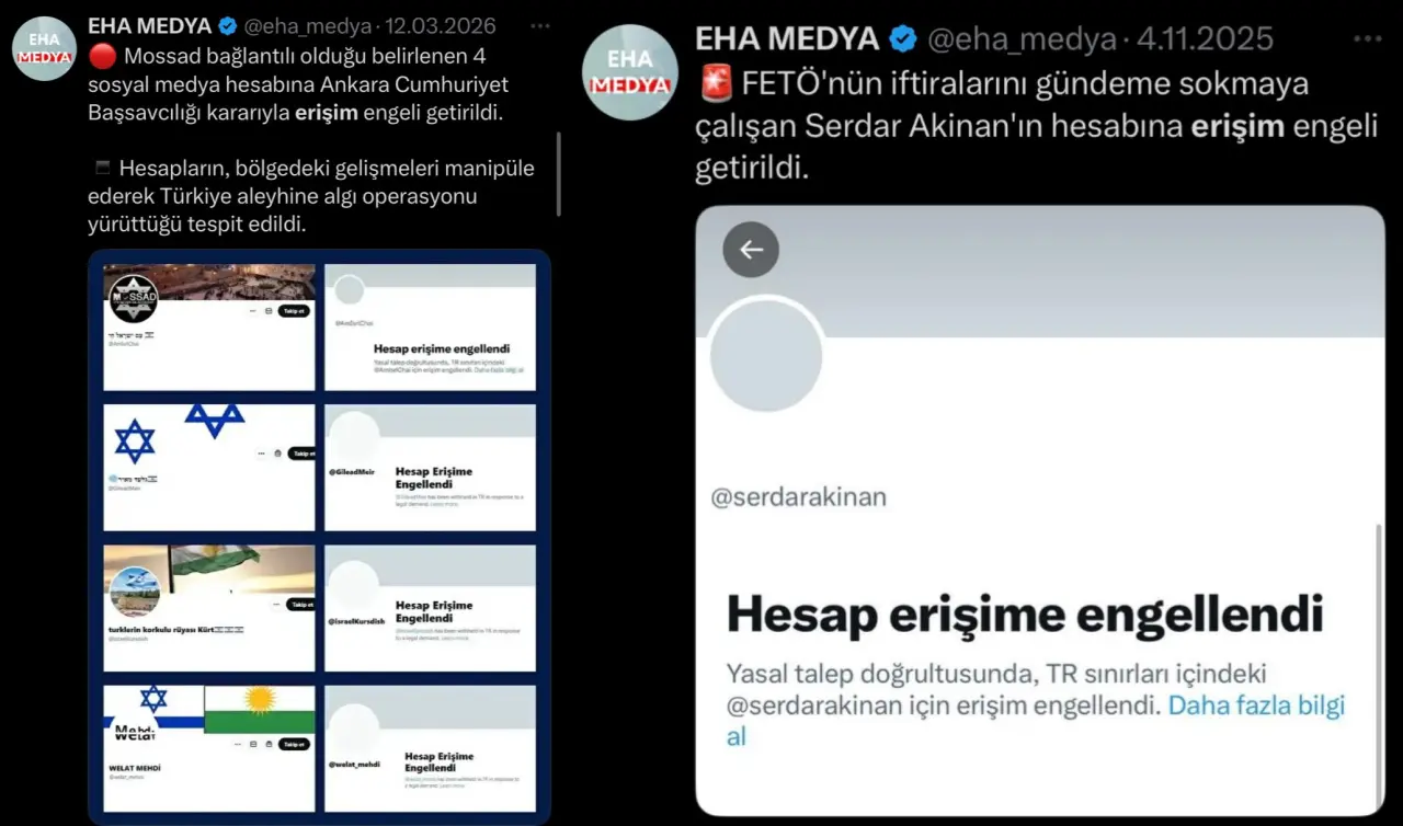 Mossad bağlantılı hesaplara erişim engeli (Mart 2026): Mart ayında da Ankara Cumhuriyet Başsavcılığı kararıyla “Mossad ile iltisaklı olduğu değerlendirilen” 4 sosyal medya hesabına erişim engeli getirilmişti. Bu kararın gerekçesi olarak, hesapların Türkiye’yi hedef alan algı faaliyetleri yürütmesi gösterilmişti.