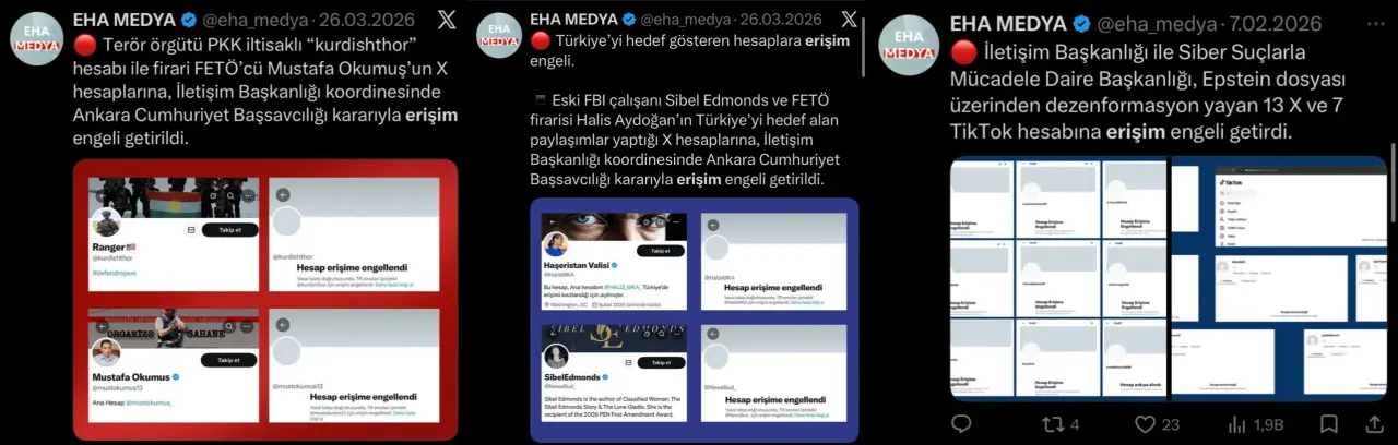 Hedef gösteren, algı yaratan hesaplara erişim engeli (Mart 2026): 3 Mart tarihinde İletişim Başkanlığı ve Ankara Cumhuriyet Başsavcılığının kararıyla Eski FBI çalışanı Sibel Edmonds ve FETÖ firarisi Halis Aydoğan’ın Türkiye’yi hedef alan paylaşımlar yaptığı X hesaplarına erişim engeli getirilmişti.