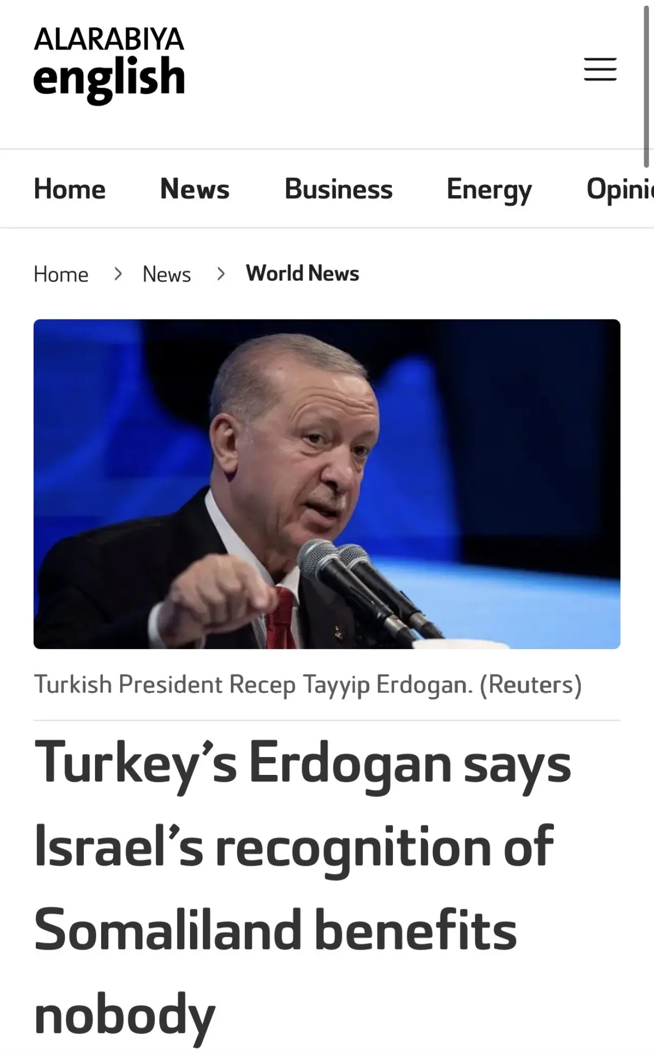 Cumhurbaşkanı Recep Tayyip Erdoğan’ın, salı günü Etiyopya ziyareti sırasında yaptığı Somaliland açıklaması uluslararası basında geniş yankı buldu. Erdoğan, İsrail’in ayrılıkçı Somaliland Cumhuriyeti’ni tanımasının ne Somaliland’a ne de bölgeye fayda sağlayacağını söyledi.