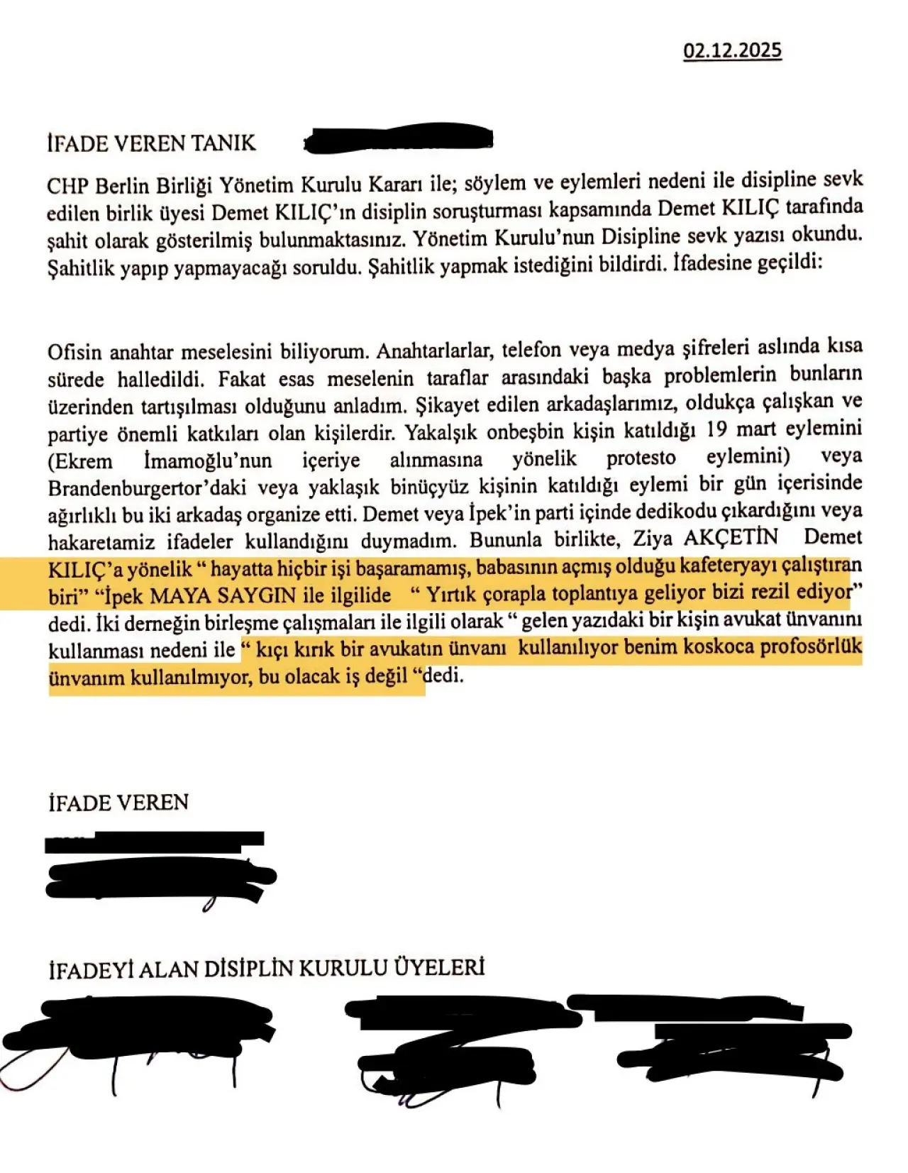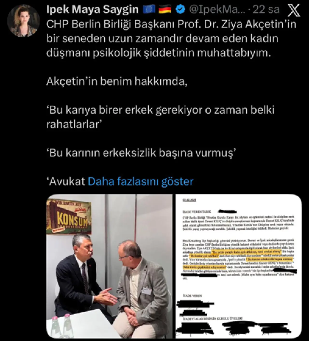 CHP Berlin Birliği Yönetim Kurulu Üyesi ve Avukat İpek Maya Saygın, Birlik Başkanı Prof. Dr. Ziya Akçetin tarafından uzun süreli psikolojik şiddete maruz kaldığını açıkladı.
