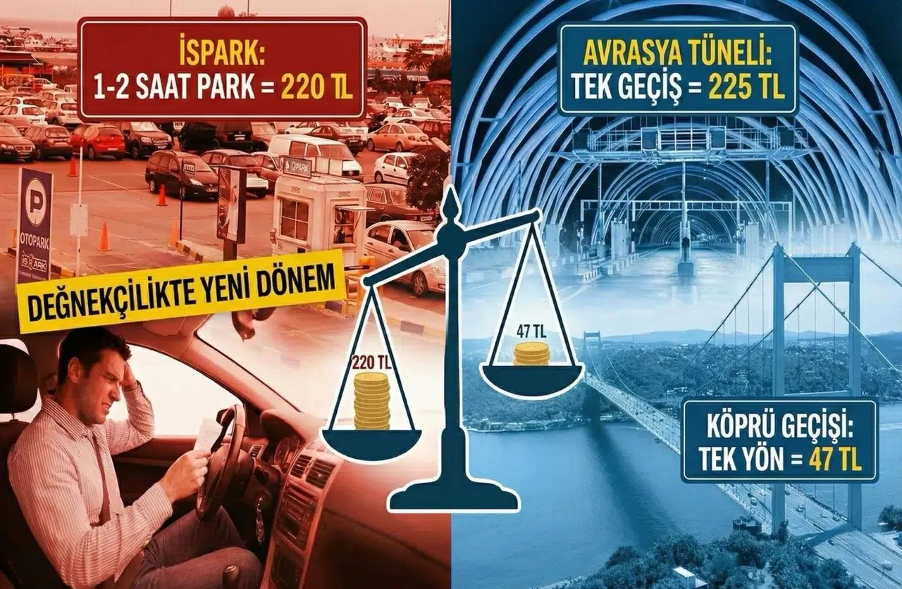 Paylaşılan verilere göre, 15 Temmuz Şehitler Köprüsü geçiş ücreti 47 TL iken, İSPARK'ta 1-2 saatlik park ücretinin 220 TL'ye yükseldiği görüldü. Avrasya Tüneli'nin 225 TL'lik geçiş ücreti ile İSPARK tarifesinin neredeyse eşitlenmesi, "Park etmek yolculuktan daha pahalı" yorumlarına neden oldu.