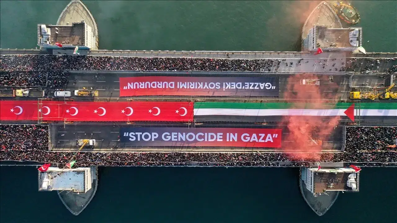 "Şehitlerimize rahmet Filistin'e destek için bugün Galata Köprüsü'nü dolduran yüzbinler gününüz aydın olsun. Yeni yılımız milletimize bütün Müslümanlara, Filistin'e huzur getirsin. Bugün burada yine yeni yılın ilk sabahında Gazze'de ve Filistin'de yaşananların yalnızca insani bir dram olmadığını, aynı zamanda küresel düzenin temellerinin sarsıldığını, ahlaki iddia taşıyan tüm uluslararası kurumların iflas ettiğini gösteren bir kırılma hattı olduğunu haykırmak için toplandık. Gazze'de yaşanan asla bir savaş değildir. Gazze'de yaşanan iki ordunun bir araya geldiği bir çatışma değildir. Gazze'de yaşanan sadece bir güvenlik meselesi değildir. Gazze'de yaşanan bir halkın kadınlarıyla çocuklarıyla yaşlılarıyla bilinçli ve sistematik bir şekilde yok edilmeye çalışıldığı bir soykırımdır.”