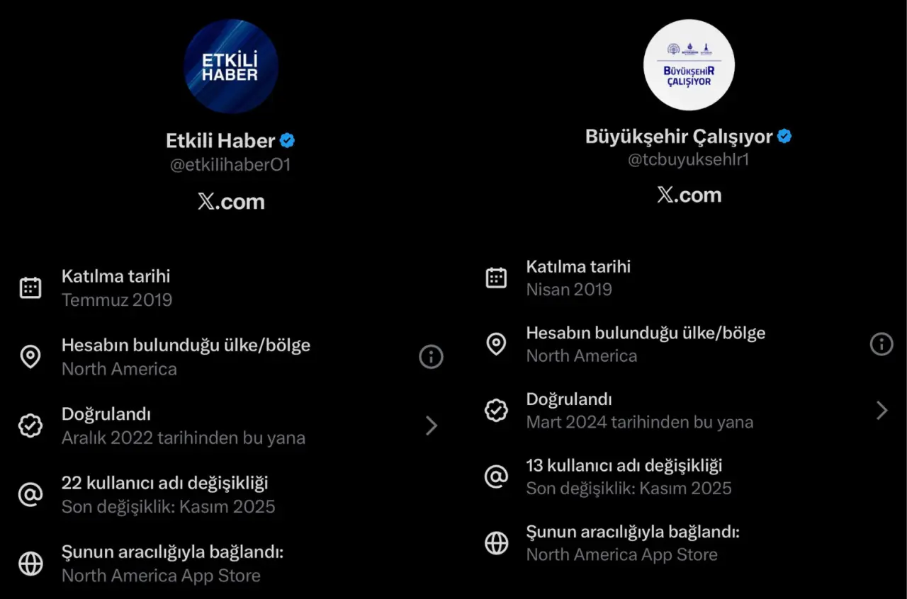 Yeni konum özelliği, Türkiye gündemine yönelik yoğun siyasi içerik üreten ve yüksek takipçi sayısına sahip bazı hesapların gerçek yerlerini ifşa etti. Örneğin; daha önce CHP ve İstanbul Büyükşehir Belediyesi'ne yakınlığı ile bilinen "Etkili Haber" ve "Büyükşehir Çalışıyor" gibi hesapların konum bilgilerinin Kuzey Amerika (North America) olarak görünmesi dikkat çekti. Manipülasyon iddialarının odağındaki bu hesapların, Türkiye'de yaşadığını iddia etmelerine veya ulusal bir gündem oluşturmalarına rağmen yurt dışından yönetildiği kesinleşmiş oldu.