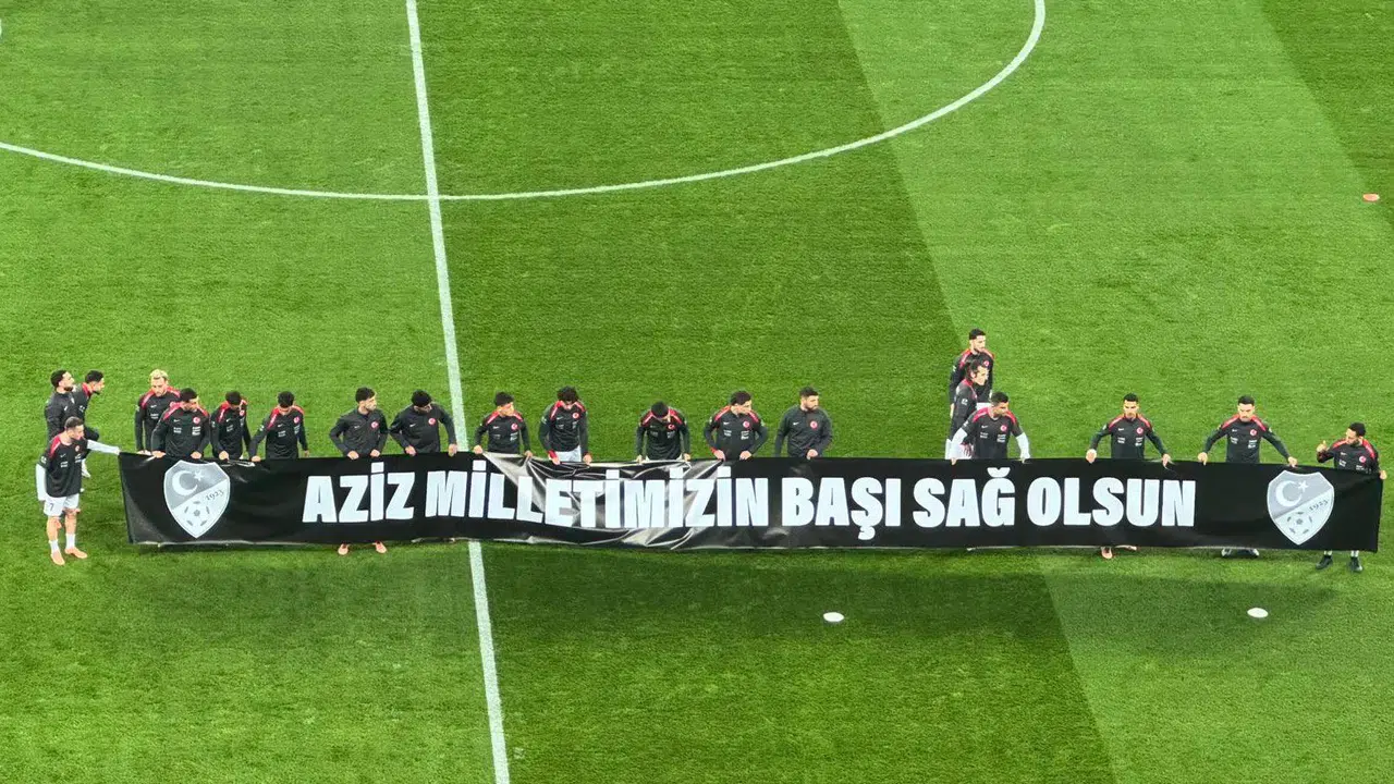 Milli oyuncularımız maç öncesi sahaya “Aziz milletimizin başı sağ olsun" pankartıyla çıkarak şehitlerimizi andı.
