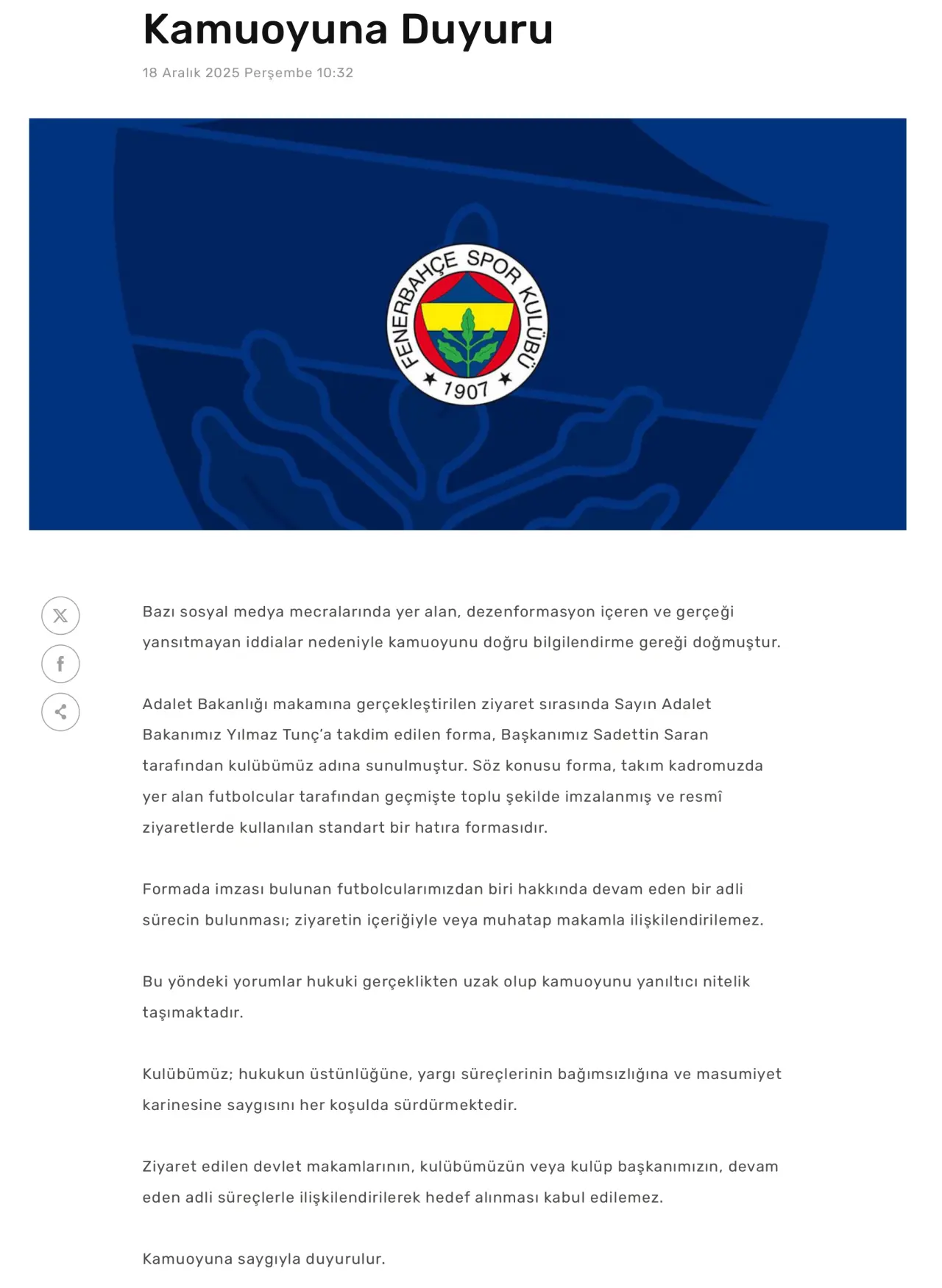 Fenerbahçe Spor Kulübü, Başkan Sadettin Saran'ın Adalet Bakanı Yılmaz Tunç'u makamında ziyaret etmesi ve kendisine forma takdim etmesi üzerine başlayan tartışmalara açıklık getirdi. Sosyal medyada, formadaki imzalar arasında hakkında adli süreç devam eden futbolcu Mert Hakan Yandaş'ın imzasının bulunması nedeniyle yapılan yorumların gerçeği yansıtmadığı vurgulandı.