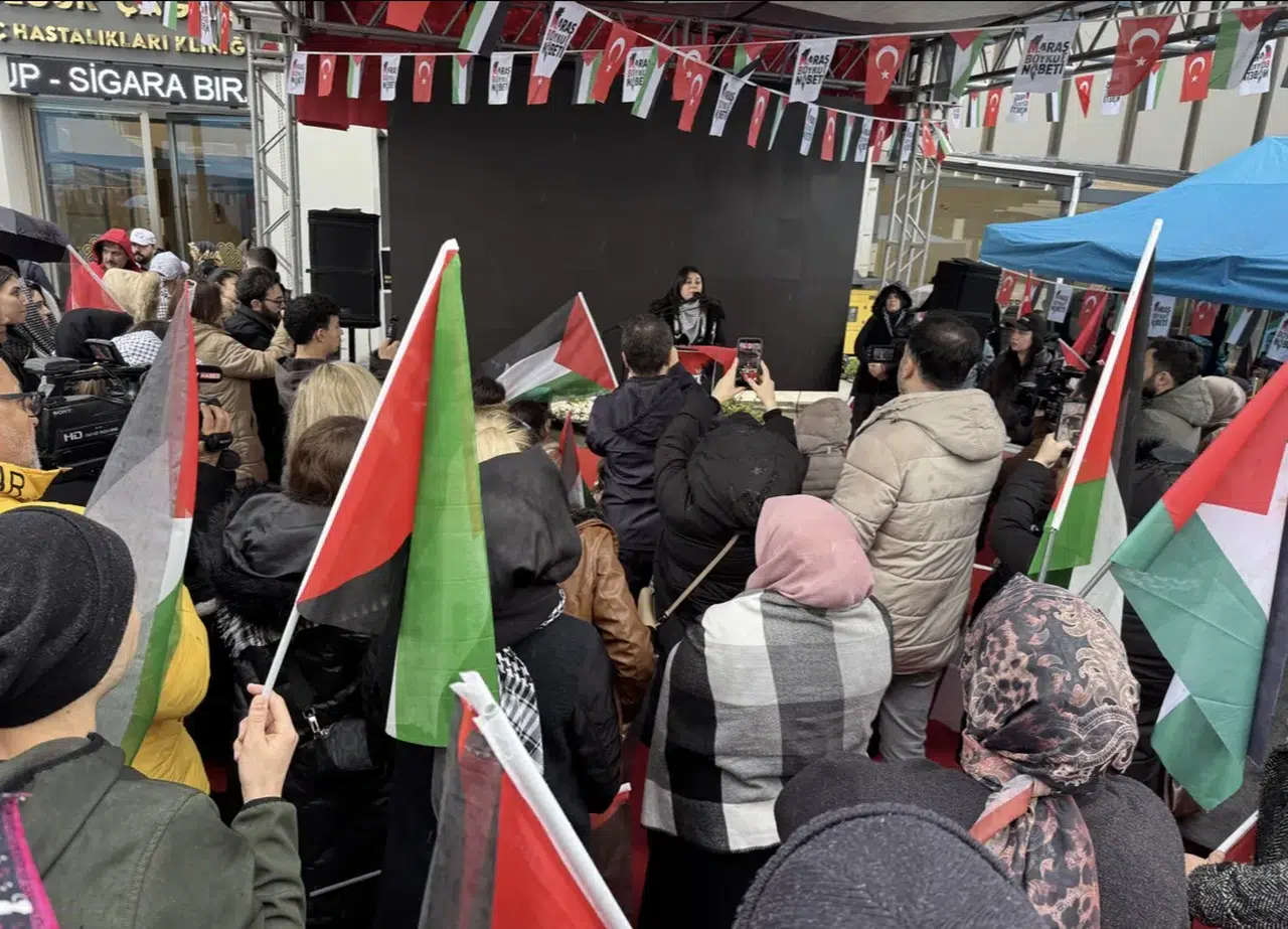 Sosyal medya platformları üzerinden organize olan vatandaşlar, Yirmiikigün Mahallesi’nde bulunan kahve zinciri Starbucks şubesi önünde bir araya geldi. Katılımcılar, Türk ve Filistin bayrakları taşıyarak boykot çağrısında bulundu.