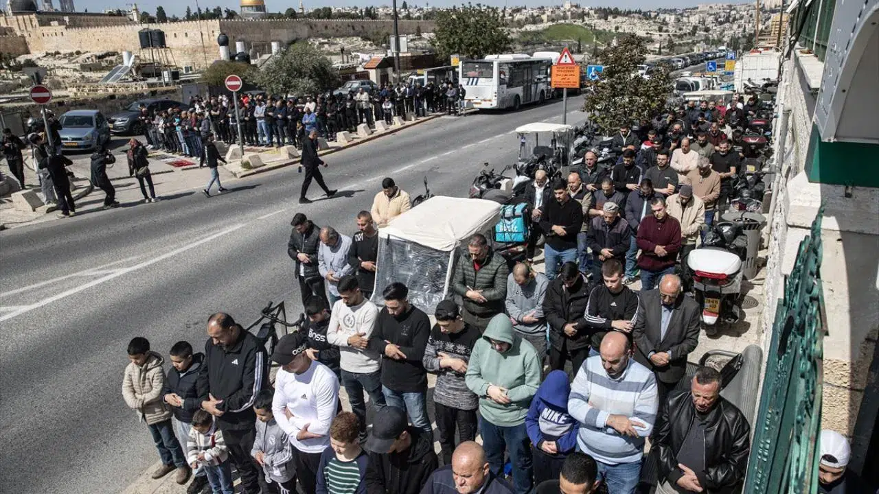 İsrail güçleri, İran’ın misilleme saldırılarını gerekçe göstererek Mescid-i Aksa’ya yönelik kısıtlamalarını sürdürüyor. Bir ayı aşkın süredir kapalı tutulan Mescid-i Aksa’ya girişlerine izin verilmeyen Filistinliler, cuma namazını kutsal mabedin çevresindeki yollarda kılmak zorunda kaldı.